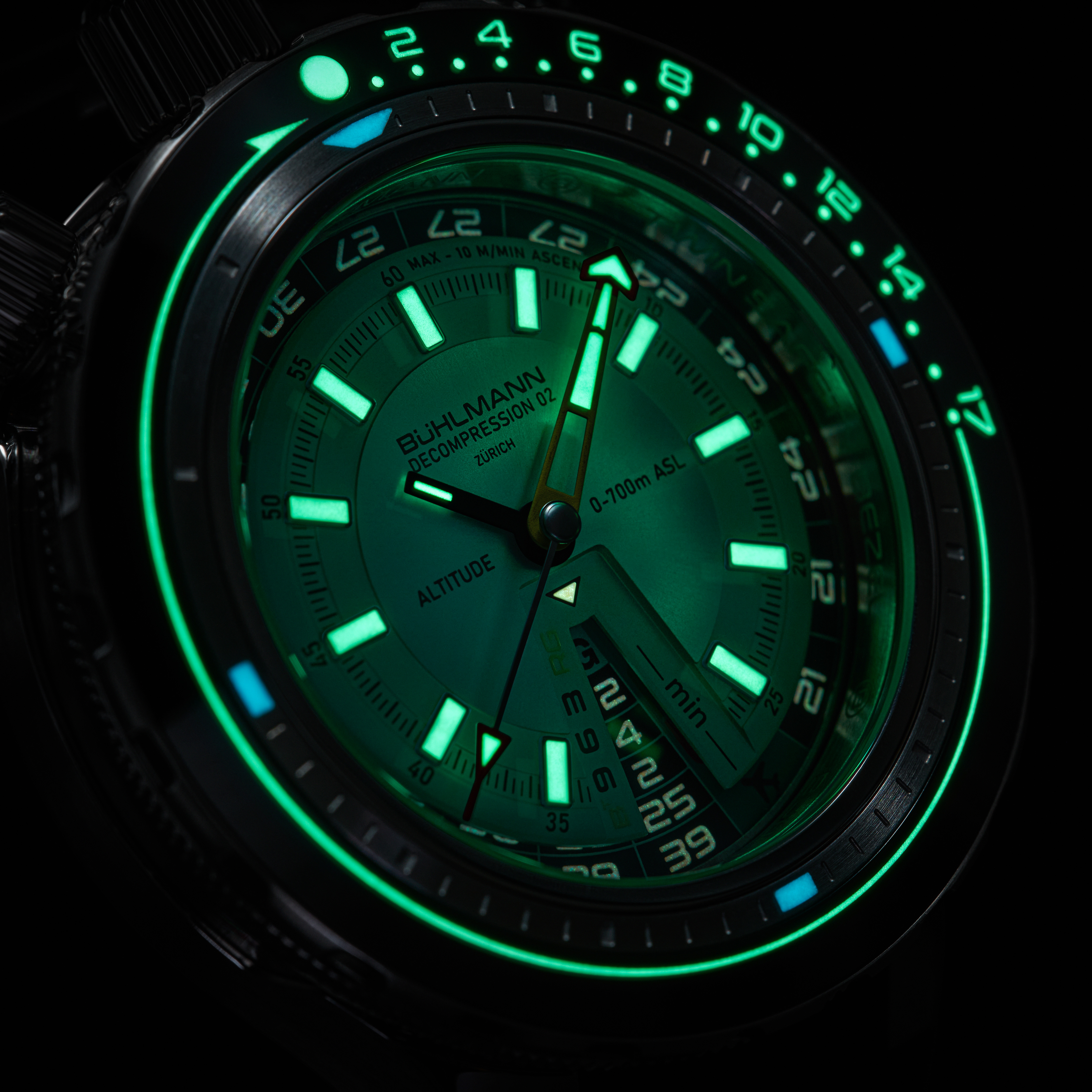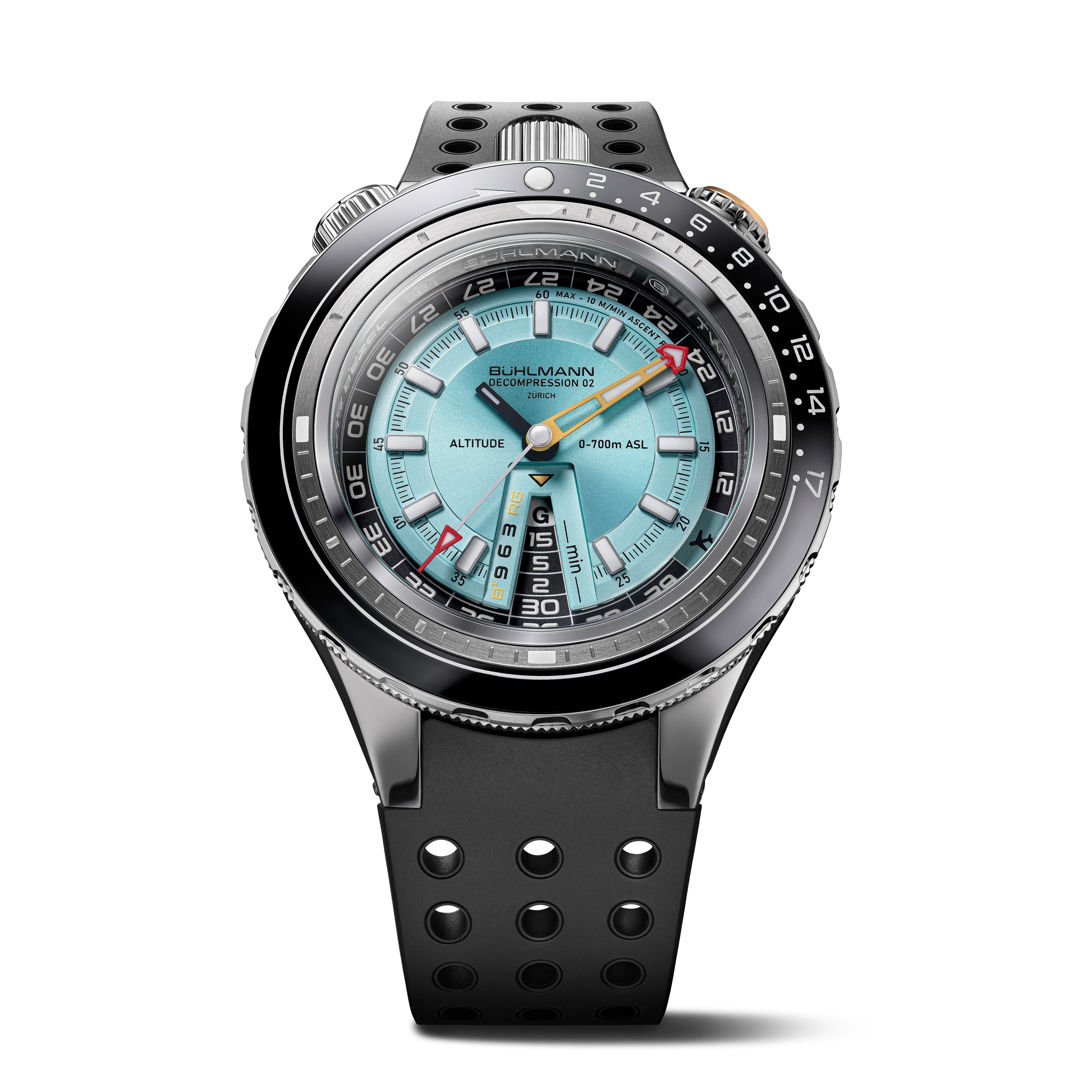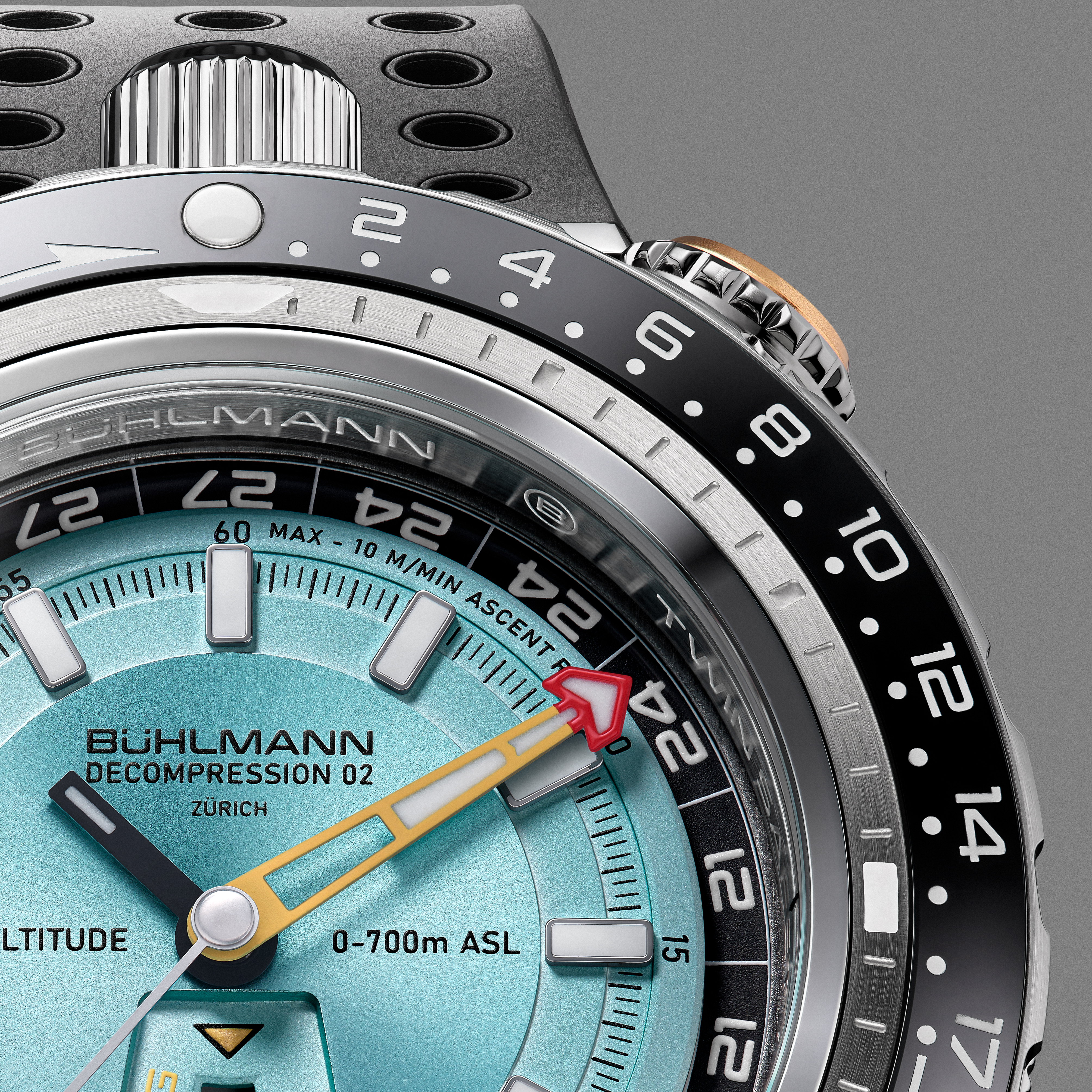 Plus audacieuse, meilleure et plus sûre que son prédécesseur, la Decompression 02 représente l’évolution fonctionnelle et ergonomique de l' acclamée Bühlmann Decompression 01, présentée pour la première fois en 2021 en collaboration avec Watch Angels. Il s’agit de la première montre de plongée mécanique dotée d’une double lunette de sécurité et d’un double cadran de paliers de décompression, permettant de gérer en toute sécurité les arrêts de décompression pour les plongées dans la “Golden Zone”.