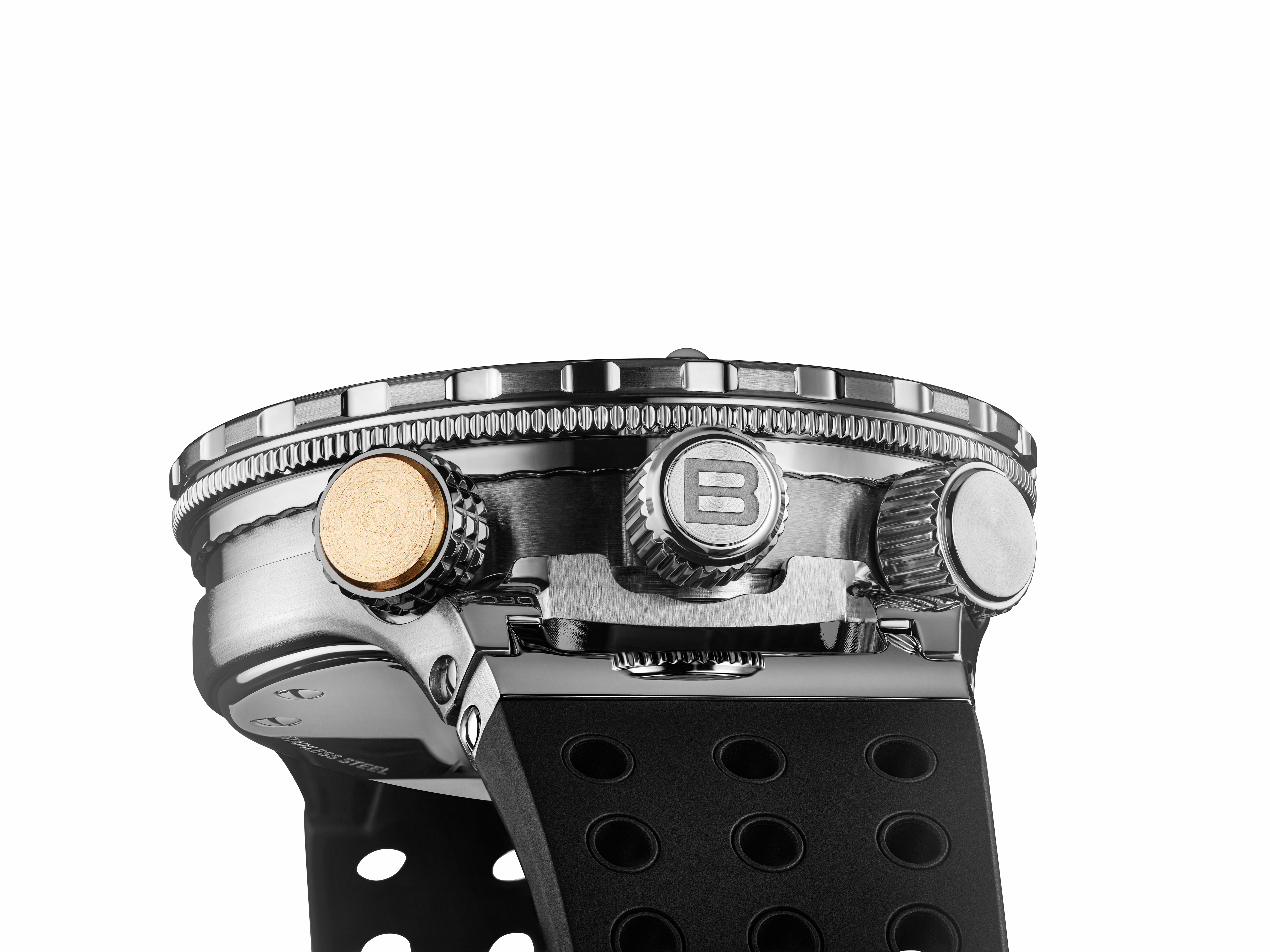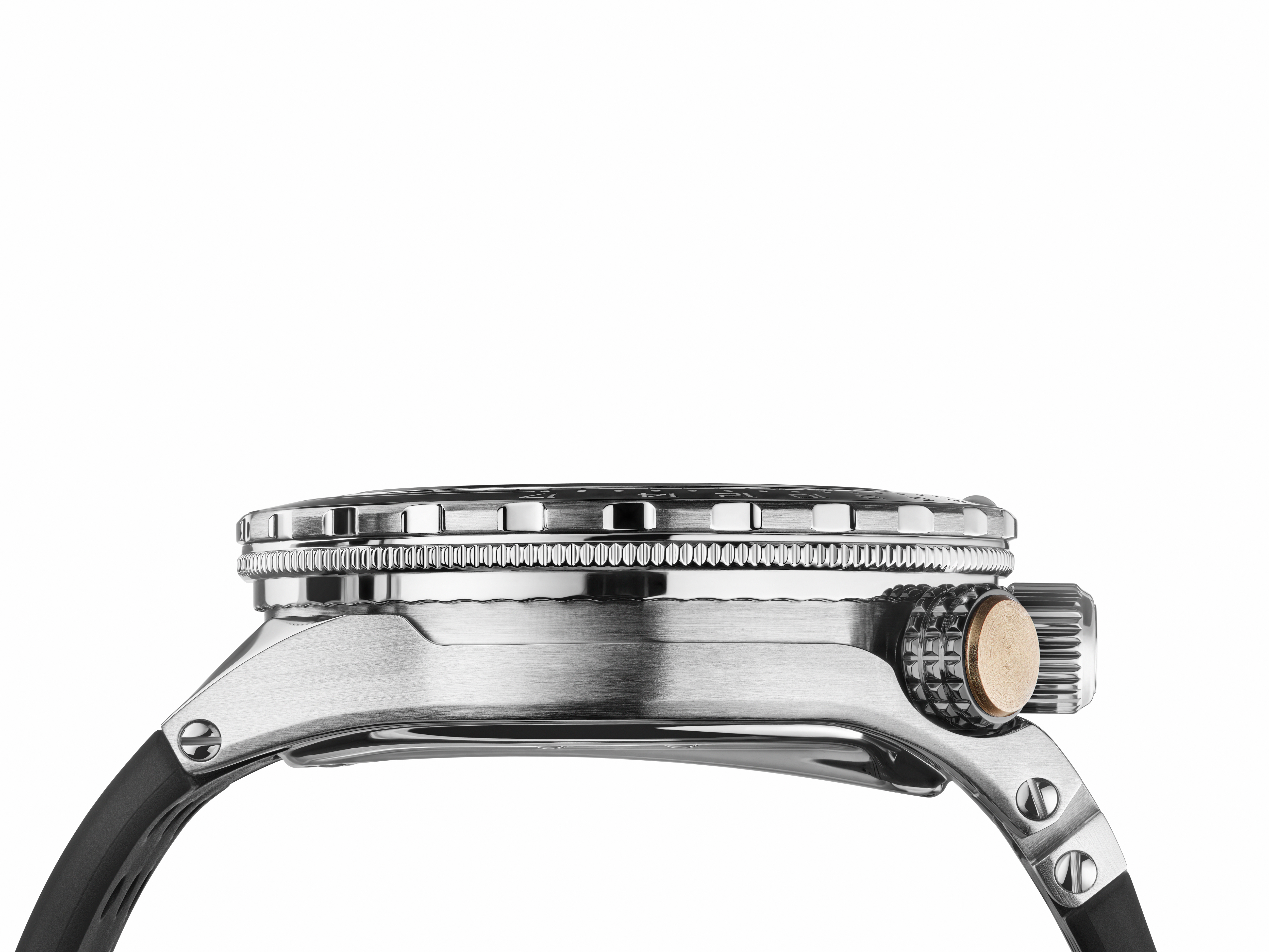 Les trois couronnes de la Bühlmann Decompression 02. Elles permettent de régler l’heure, de définir le profil de plongée et d’actionner la Twin Safety Bezel.