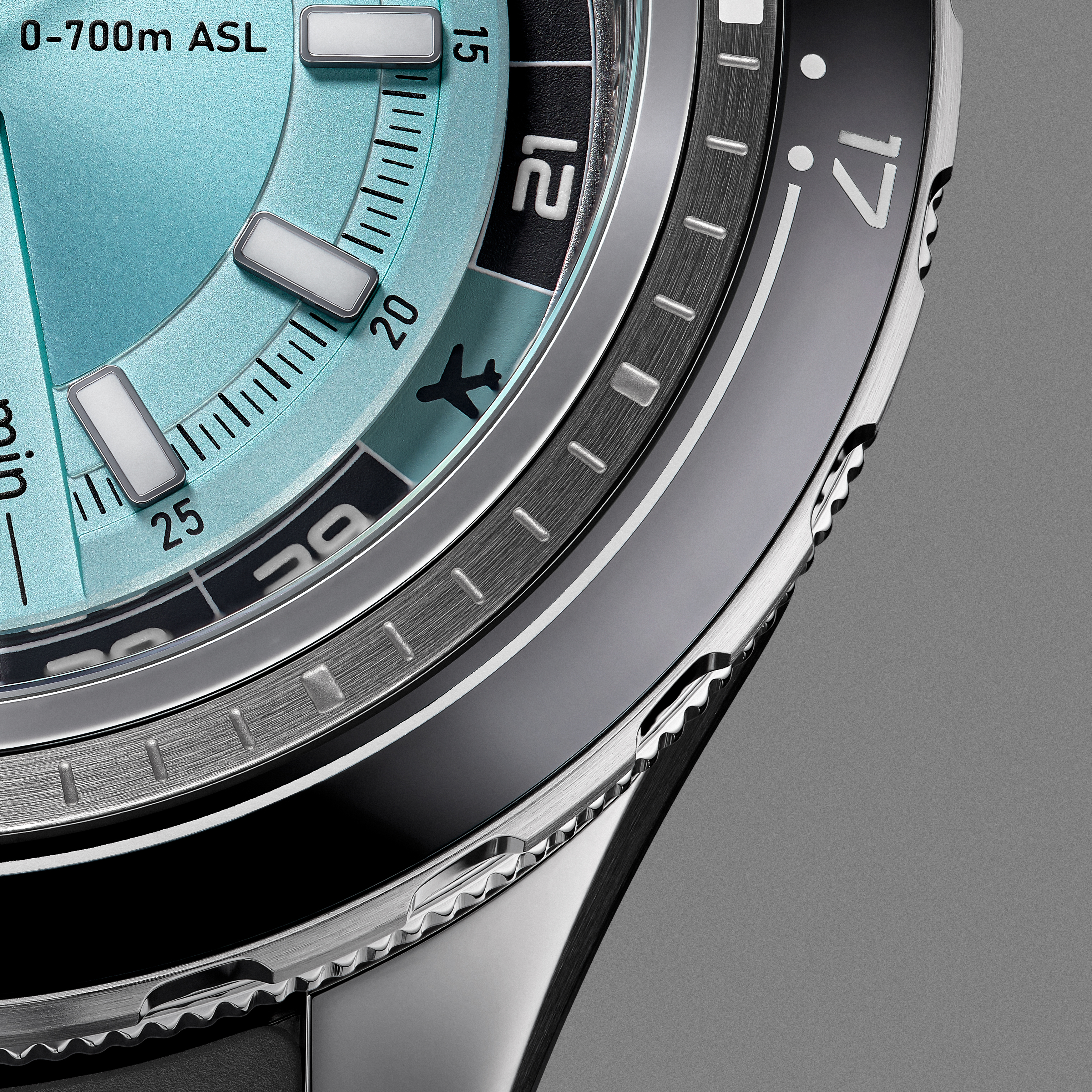 - Twin Decompression Dial® : deux cadrans avec un sous-cadran rotatif intégrant les données de décompression ZH-L16, visibles à travers une ouverture en saphir.